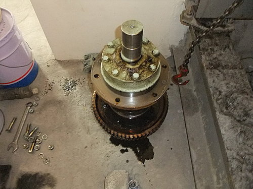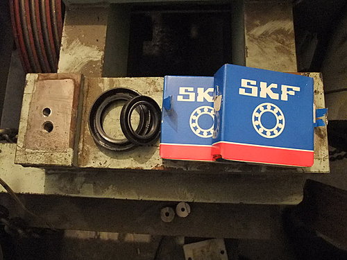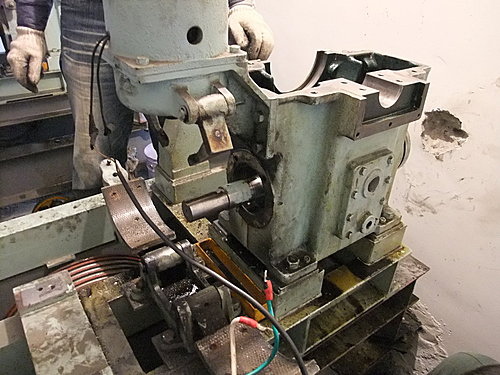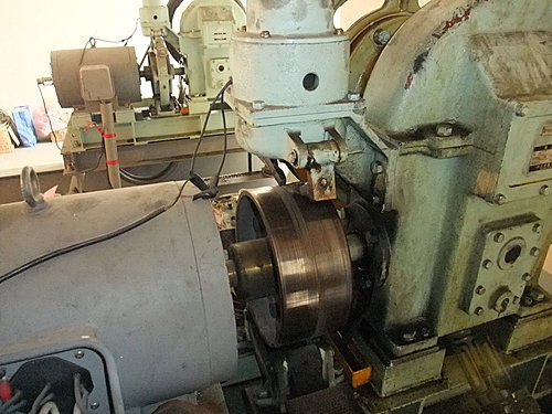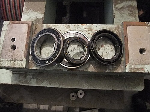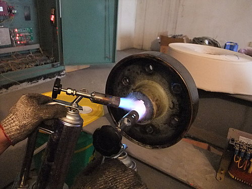 加熱中的煞車鼔,利用熱漲冷縮原理要裝回換好油封和軸承的主機入力軸上