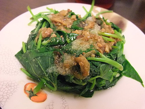 地瓜葉淋上肉燥和蒜泥拌一拌就很美味了.