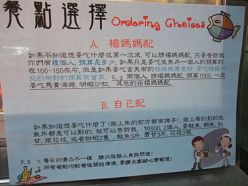 點餐的說明,由於剛剛才從嵐肉燥走出來,小小逛了一圈. 還很飽. 所以選擇了自己配(兩人$400,點三種生魚片)