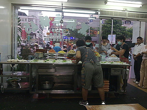 老闆娘正勤奮的製做潤餅中,配料滿滿的擺在工作台上.