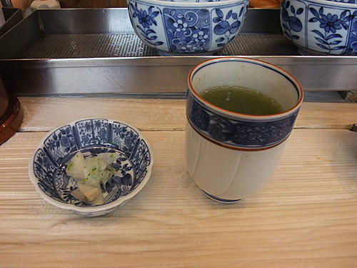 坐上座後我們點了鮪魚蓋飯,老闆隨後奉上兩杯現泡綠茶,,然後跟我們收了料金日幣800*2 .
