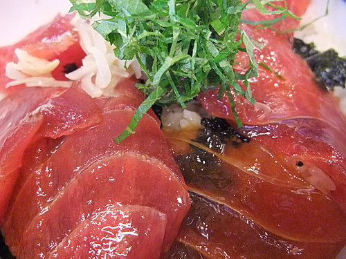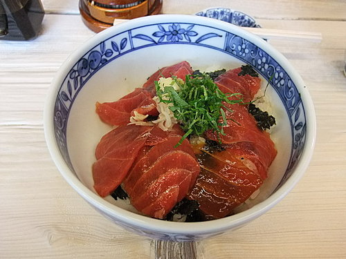 瀨川著名的鮪魚蓋飯,新鮮鮪魚生魚片先用獨家醬汁醃過,然後配上海苔和日本蔥末.