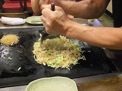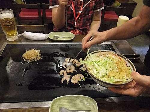 來月島,當然要吃月島燒,但不會煎, 有請老闆代勞了.