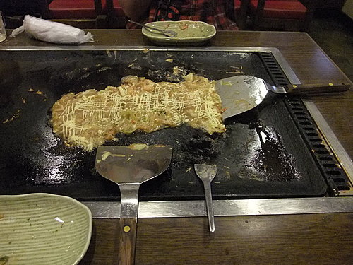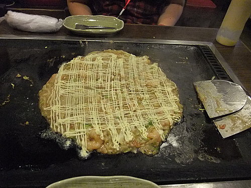 好吃的月島燒終於完成了,再淋上美乃滋就完成了月島著名的美食了.