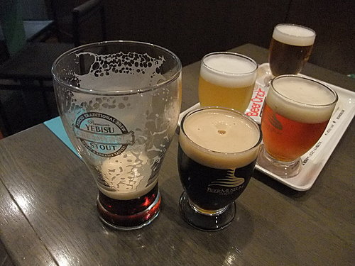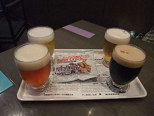 喝完黑啤酒覺得不過癮,又另外再點這4種小杯啤酒套餐(日幣500),有一般啤酒,金黃色啤酒和琥珀色啤酒