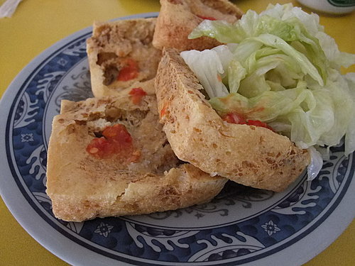 這是個人到目前為止,吃過最好吃的臭豆腐. 臭豆腐炸得外皮脆而不乾,配上好吃泡菜.....