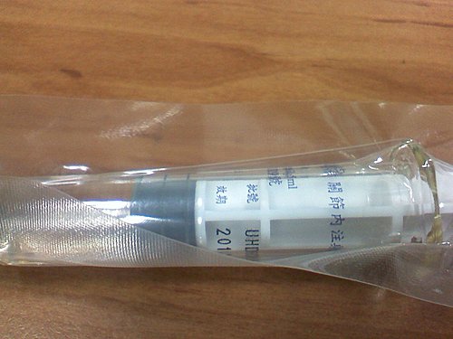 針頭還滿長的,要將玻尿酸打入關節腔中.