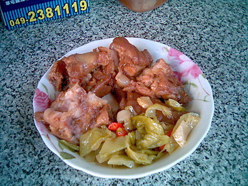 來個特寫,他的特色就是 榨菜,辣辣的配豬腳就是好吃. 還有一必點的是排骨湯,用排骨加整個蒜頭