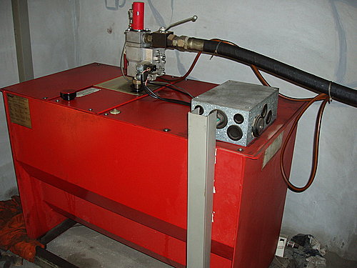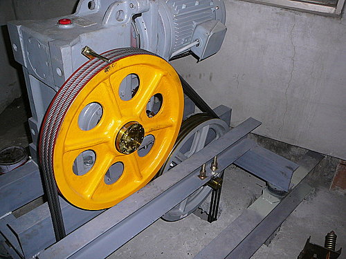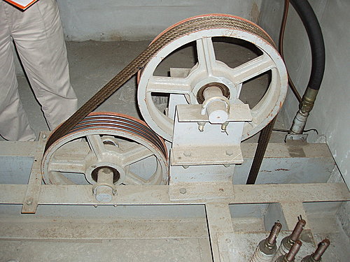 機房內的主鋼索輪,右側是油壓管.配重側為2:1(縮短油壓缸行程),右前可以看到鋼索頭.
