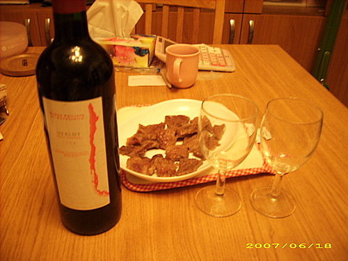 紅酒配 COSTCO 買的牛小排,味道很正. 牛小排是我煎的, ㄟ 口水流出來了啦!!!!