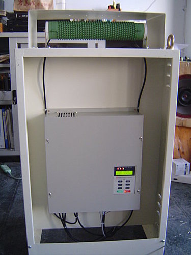 控制盤的背後,HITAKE的薄型變頻器,最上面是煞車(回生)電阻器.