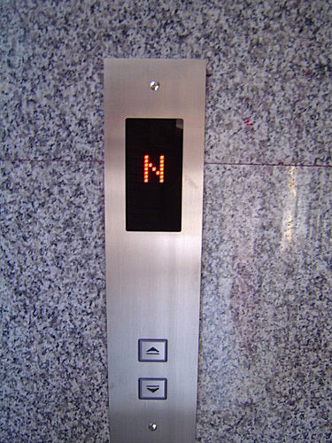 車廂行駛中時的顯示,電梯行駛中箭號會依方向移動,到樓時樓層數字閃動提醒到樓.