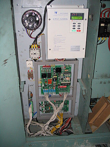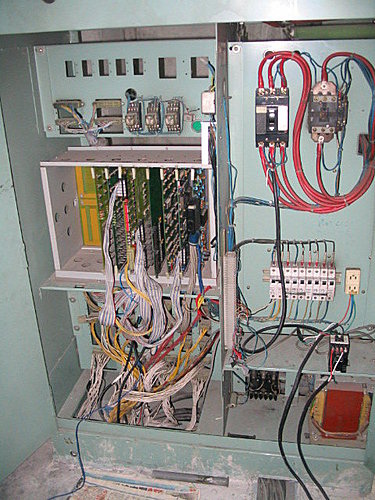 原控制盤,錯綜複雜的連線.高斯達公司已被另一家電梯公司併購,所以這電梯就變成電梯孤兒了